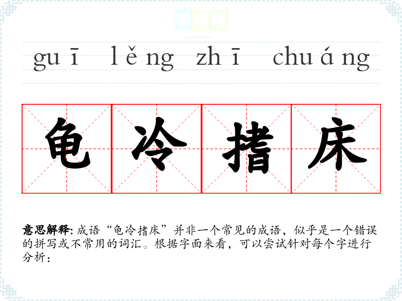 成语“龟冷搘床”并非一个常见的成语,似乎是一个错误的拼写或不常用的词汇。根据字面来看,可以尝试针对每个字进行分析: