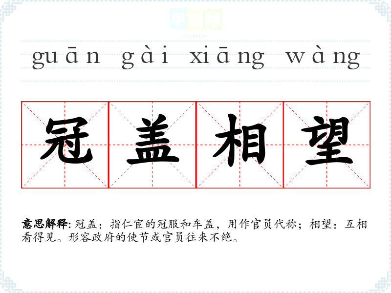 | 冠盖相属 | 冠盖:古代官吏的冠服和车盖,代指官吏;属:接连。形容政府的使节或官员,一路上往来不绝。也指世代仕宦,相继不断。 |