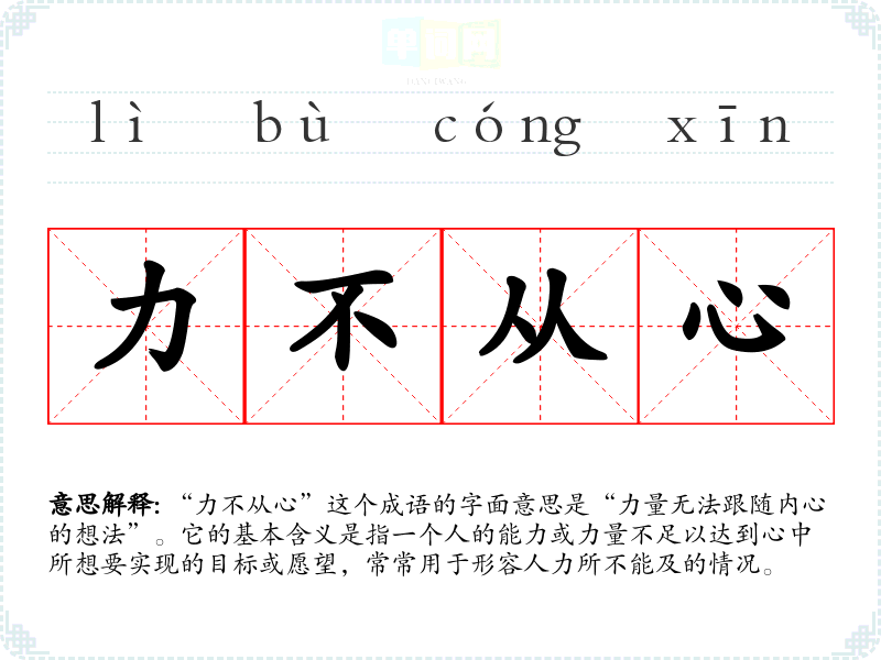 “力不从心”这个成语的字面意思是“力量无法跟随内心的想法”。它的基本含义是指一个人的能力或力量不足以达到心中所想要实现的目标或愿望,常常用于形容人力所不能及的情况。