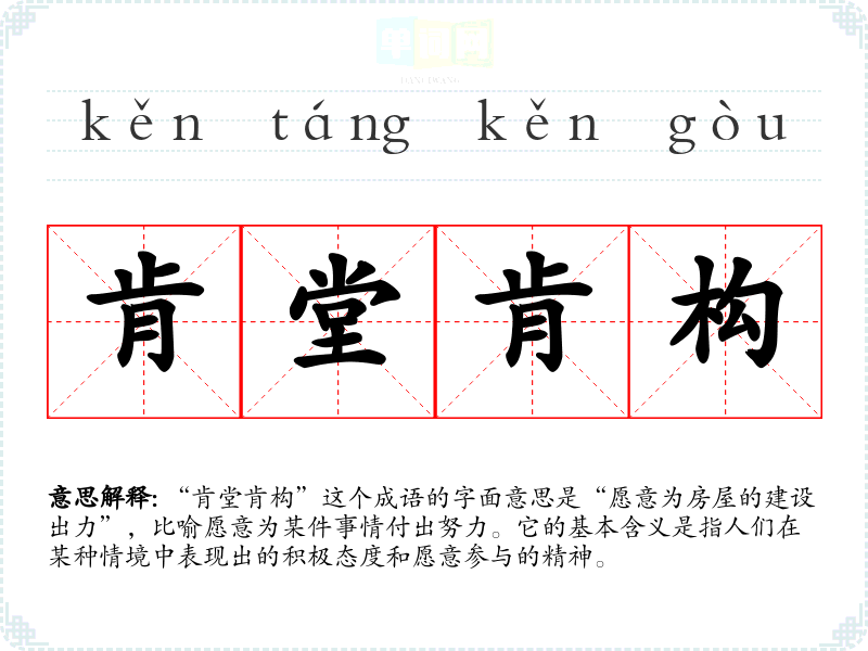 “肯堂肯构”这个成语的字面意思是“愿意为房屋的建设出力”,比喻愿意为某件事情付出努力。它的基本含义是指人们在某种情境中表现出的积极态度和愿意参与的精神。