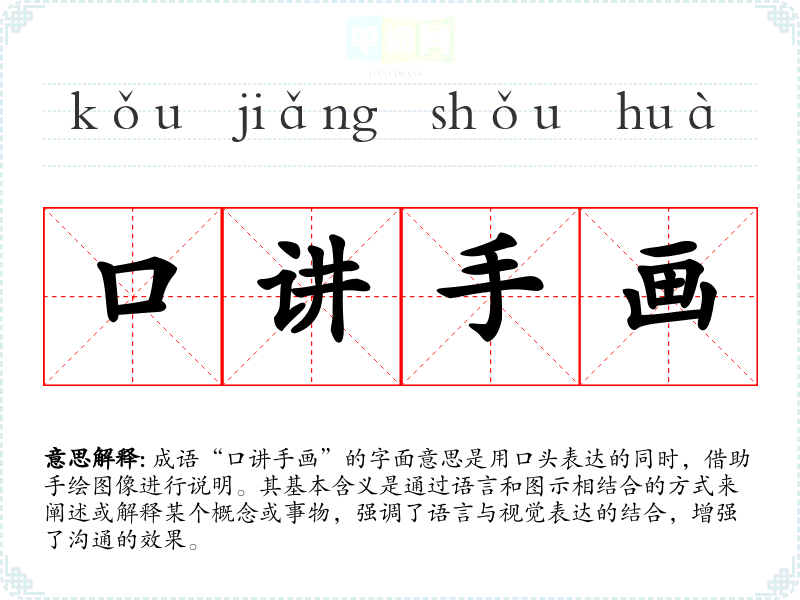 成语“口讲手画”的字面意思是用口头表达的同时,借助手绘图像进行说明。其基本含义是通过语言和图示相结合的方式来阐述或解释某个概念或事物,强调了语言与视觉表达的结合,增强了沟通的效果。