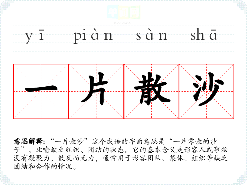 “一片散沙”这个成语的字面意思是“一片零散的沙子”,比喻缺乏组织、团结的状态。它的基本含义是形容人或事物没有凝聚力,散乱而无力,通常用于形容团队、集体、组织等缺乏团结和合作的情况。