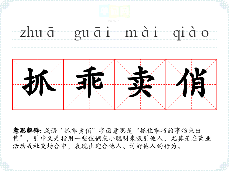 成语“抓乖卖俏”字面意思是“抓住乖巧的事物来出售”,引申义是指用一些伎俩或小聪明来吸引他人,尤其是在商业活动或社交场合中,表现出迎合他人、讨好他人的行为。