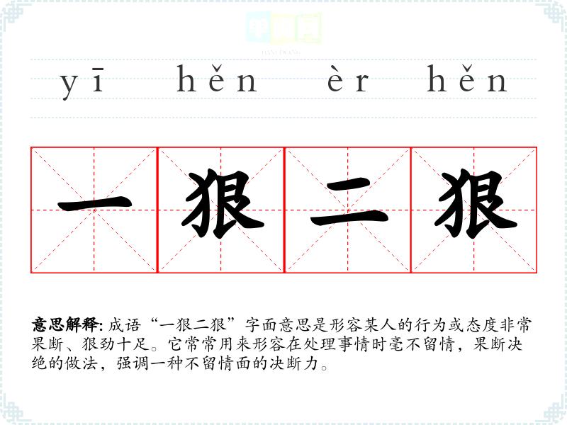 - 例子:他在工作中总是一狠二狠,决策从不拖泥带水。