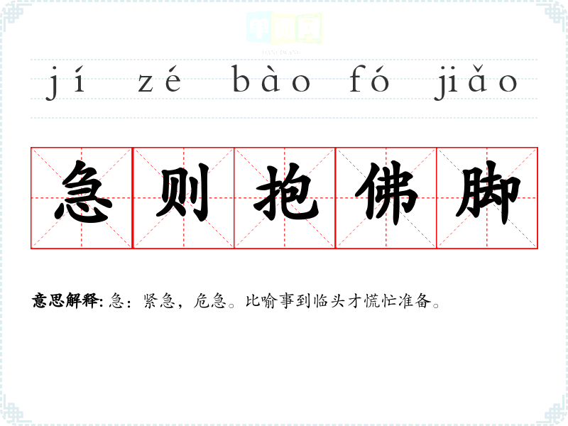 | 临时抱佛脚 | 原意为年老信佛,以求保佑,有临渴掘井之意。后因称平时无准备而事急时仓猝张罗为“临时抱佛脚”。 |