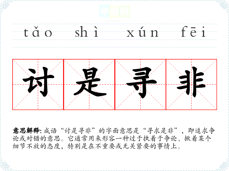 成语“讨是寻非”的字面意思是“寻求是非”,即追求争论或对错的意思。它通常用来形容一种过于执着于争论、揪着某个细节不放的态度,特别是在不重要或无关紧要的事情上。