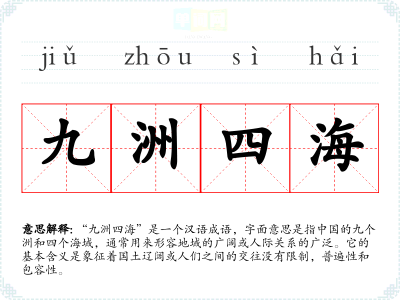“九洲四海”源于古代的地理观念,古人认为的土地分为九个洲,海洋分为四个方向。这一说法在《尚书》《周礼》等古典文献中都有体现,表达了古人对国家和世界的理解与认知。随着时间的推移,这个成语逐渐演变为形容广泛、包容的象征。