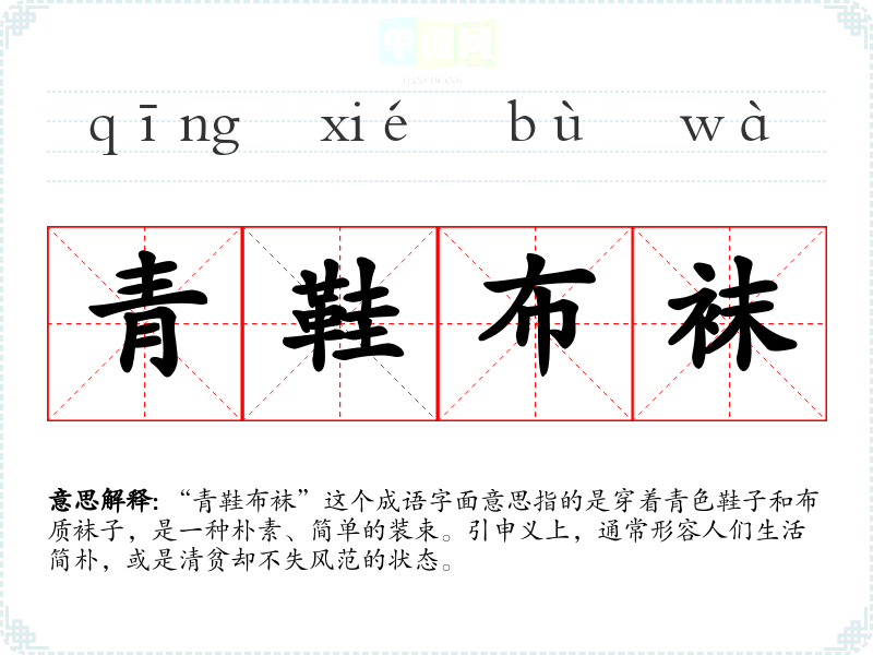 “青鞋布袜”这个成语字面意思指的是穿着青色鞋子和布质袜子,是一种朴素、简单的装束。引申义上,通常形容人们生活简朴,或是清贫却不失风范的状态。