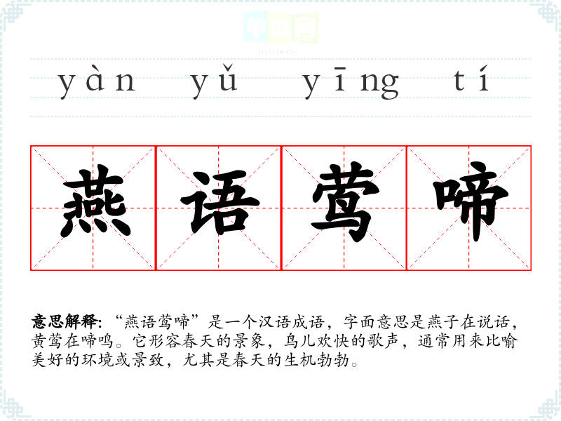 “燕语莺啼”是一个汉语成语,字面意思是燕子在说话,黄莺在啼鸣。它形容春天的景象,鸟儿欢快的歌声,通常用来比喻美好的环境或景致,尤其是春天的生机勃勃。