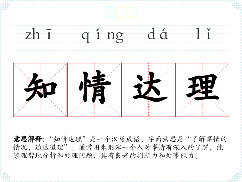 “知情达理”是一个汉语成语,字面意思是“了解事情的情况,通达道理”。通常用来形容一个人对事情有深入的了解,能够理智地分析和处理问题,具有良好的判断力和处事能力。