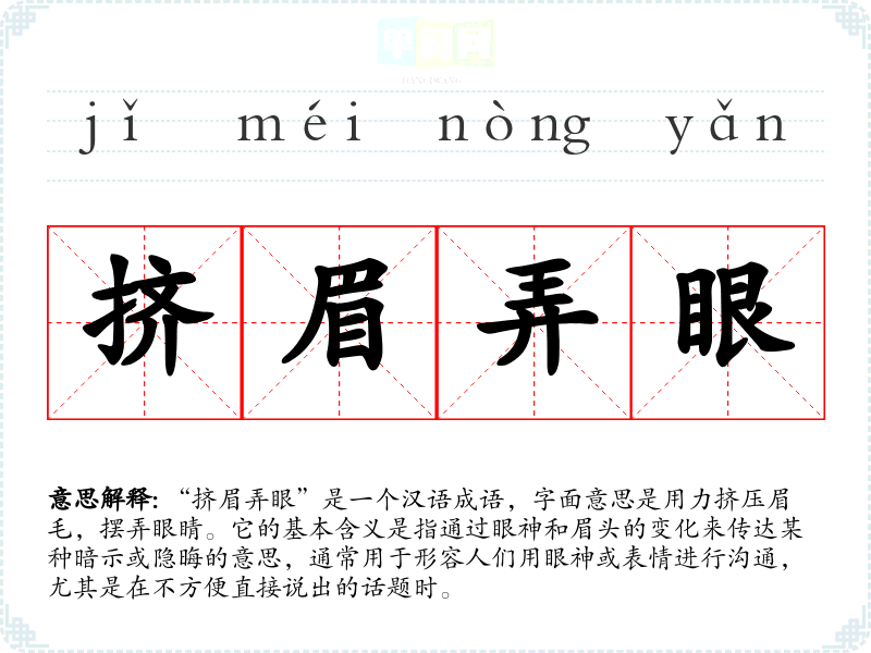 “挤眉弄眼”是一个汉语成语,字面意思是用力挤压眉毛,摆弄眼睛。它的基本含义是指通过眼神和眉头的变化来传达某种暗示或隐晦的意思,通常用于形容人们用眼神或表情进行沟通,尤其是在不方便直接说出的话题时。
