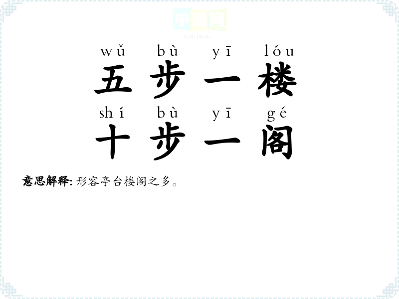 | 五步一楼,十步一阁 | 形容亭台楼阁之多。 |