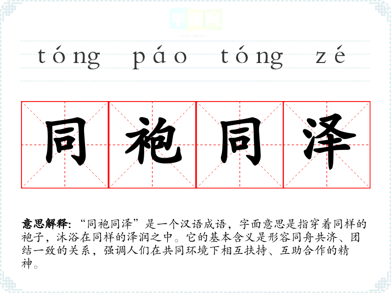 “同袍同泽”是一个汉语成语,字面意思是指穿着同样的袍子,沐浴在同样的泽润之中。它的基本含义是形容同舟共济、团结一致的关系,强调人们在共同环境下相互扶持、互助合作的精神。