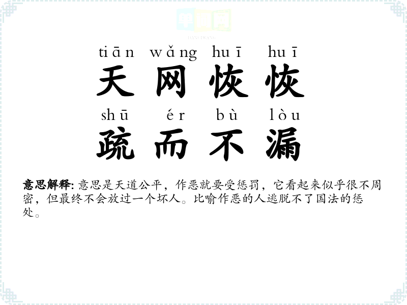 | 天网恢恢,疏而不失 | 意思是天道公平,作恶就要受惩罚,它看起来似乎很不周密,但最终不会放过一个坏人。比喻作恶的人逃脱不了国法的惩处。 |