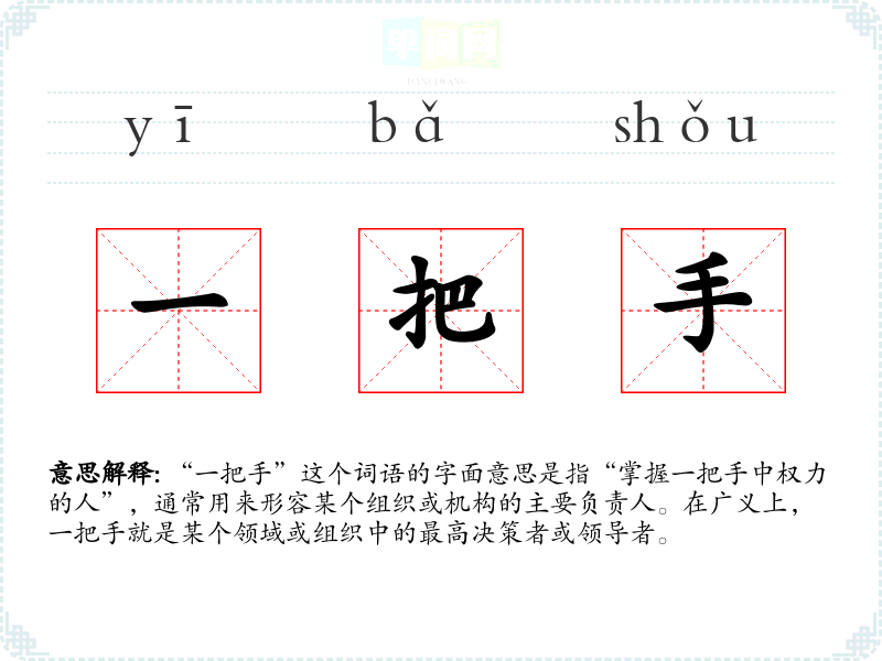“一把手”这个词语的字面意思是指“掌握一把手中权力的人”,通常用来形容某个组织或机构的主要负责人。在广义上,一把手就是某个领域或组织中的最高决策者或领导者。