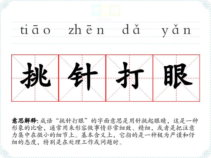 成语“挑针打眼”的字面意思是用针挑起眼睛,这是一种形象的比喻,通常用来形容做事情非常细致、精细,或者是把注意力集中在微小的细节上。基本含义上,它指的是一种极为严谨和仔细的态度,特别是在处理工作或问题时。