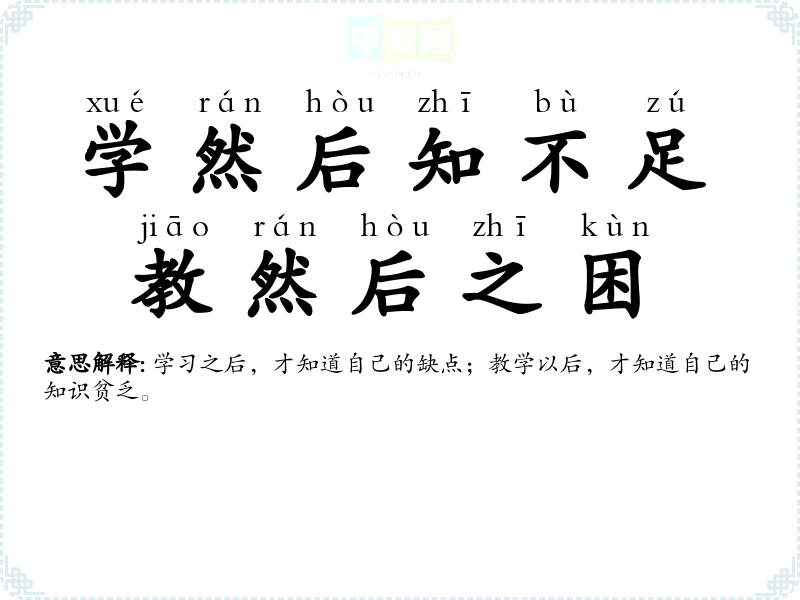 | 学然后知不足,教然后知困 | 学习之后,才知道自己的缺点;教学以后,才知道自己的知识贫乏。 |