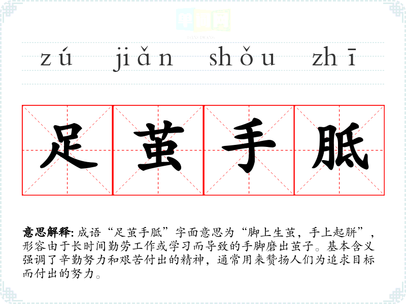 成语“足茧手胝”字面意思为“脚上生茧,手上起胼”,形容由于长时间勤劳工作或学*而导致的手脚磨出茧子。基本含义强调了辛勤努力和艰苦付出的精神,通常用来赞扬人们为追求目标而付出的努力。