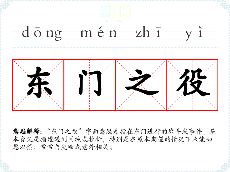 - 反义成语:大获全胜、如愿以偿、成功等,强调的是成功和顺利的结果,与“东门之役”的失败形成鲜明对比。