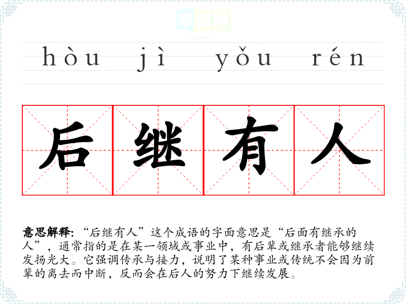 “后继有人”这个成语的字面意思是“后面有继承的人”,通常指的是在某一领域或事业中,有后辈或继承者能够继续发扬光大。它强调传承与接力,说明了某种事业或传统不会因为前辈的离去而中断,反而会在后人的努力下继续发展。