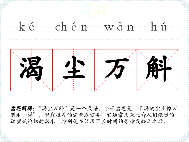 “渴尘万斛”是一个成语,字面意思是“干渴的尘土像万斛水一样”,形容极度的渴望或需要。它通常用来比喻人们强烈的欲望或迫切的需求,特别是在经历了长时间的等待或缺乏之后。