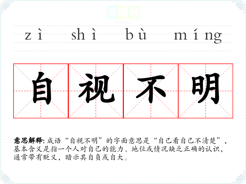 成语“自视不明”的字面意思是“自己看自己不清楚”,基本含义是指一个人对自己的能力、地位或情况缺乏正确的认识,通常带有贬义,暗示其自负或自大。