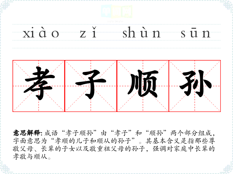 成语“孝子顺孙”由“孝子”和“顺孙”两个部分组成,字面意思为“孝顺的儿子和顺从的孙子”。其基本含义是指那些尊敬父母、长辈的子女以及敬重祖父母的孙子,强调对家庭中长辈的孝敬与顺从。