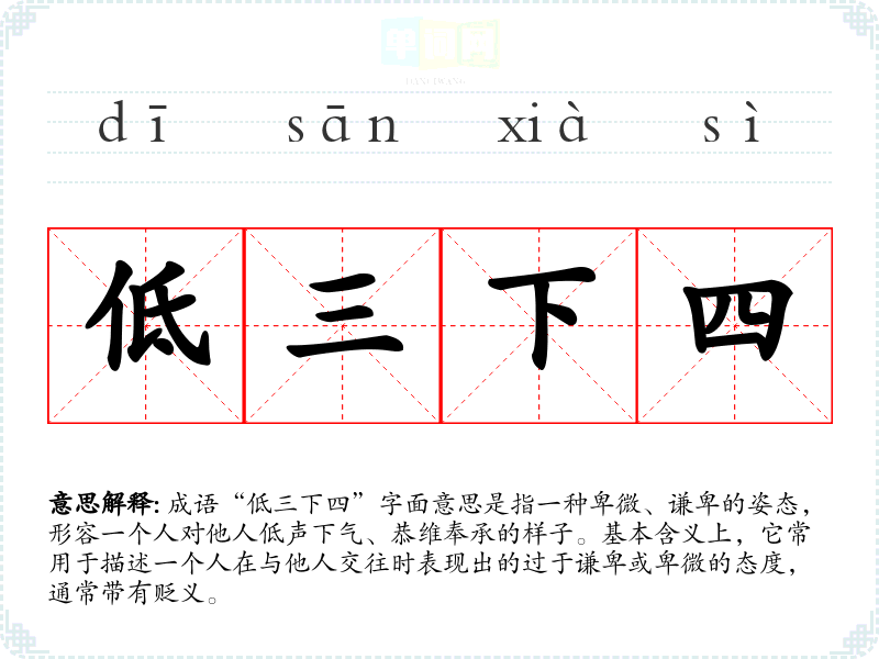成语“低三下四”字面意思是指一种卑微、谦卑的姿态,形容一个人对他人低声下气、恭维奉承的样子。基本含义上,它常用于描述一个人在与他人交往时表现出的过于谦卑或卑微的态度,通常带有贬义。