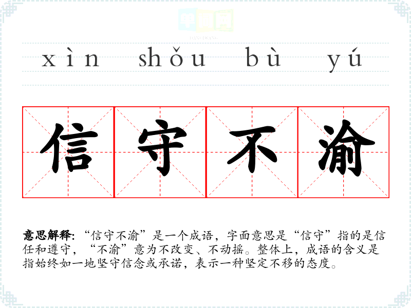 “信守不渝”是一个成语,字面意思是“信守”指的是信任和遵守,“不渝”意为不改变、不动摇。整体上,成语的含义是指始终如一地坚守信念或承诺,表示一种坚定不移的态度。