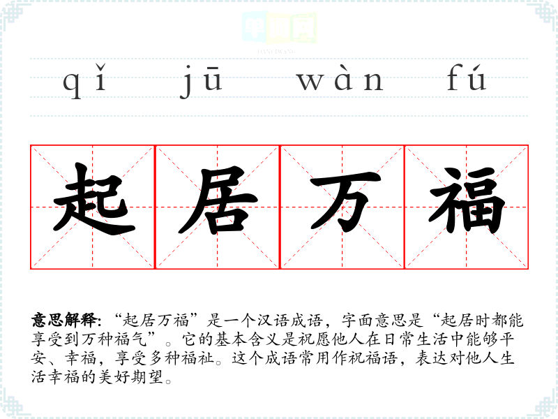 “起居万福”是一个汉语成语,字面意思是“起居时都能享受到万种福气”。它的基本含义是祝愿他人在日常生活中能够平安、幸福,享受多种福祉。这个成语常用作祝福语,表达对他人生活幸福的美好期望。