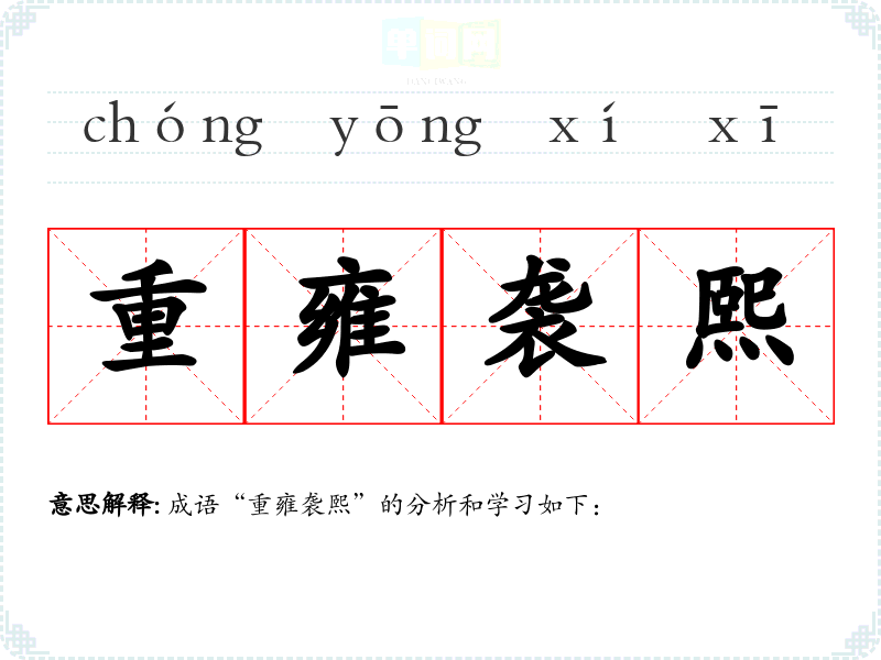 成语“重雍袭熙”的具体历史背景并不十分明确,可能源于古代文人的诗词或典故。它的构成部分“重”、“雍”、“袭”、“熙”都与古代文化、政治或社会的和谐状态有直接关联,反映了古人对社会稳定和发展的向往。
