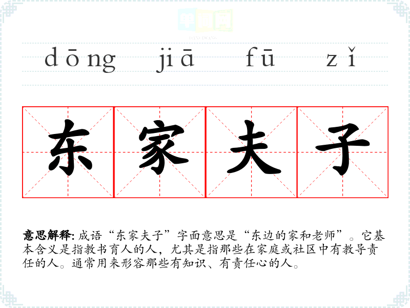 “东家夫子”出自《太原志》,书中提到东家有位夫子,意指东边的老师或教书的人。这个成语反映了古代社会对教育的重视,以及家庭和社会对知识传播者的尊重。
