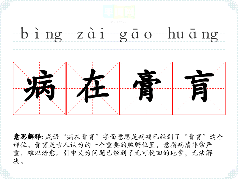 | 病入膏肓 | 膏肓:古人把心尖脂肪叫“膏”,心脏与膈膜之间叫“肓”。形容病情十分严重,无法医治。比喻事情到了无法挽救的地步。 |