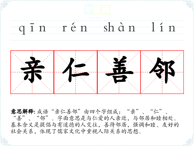 成语“亲仁善邻”由四个字组成:“亲”、“仁”、“善”、“邻”。字面意思是与仁爱的人亲近,与邻居和睦相处。基本含义是提倡与有道德的人交往,善待邻居,强调和睦、友好的社会关系,体现了儒家文化中重视人际关系的思想。