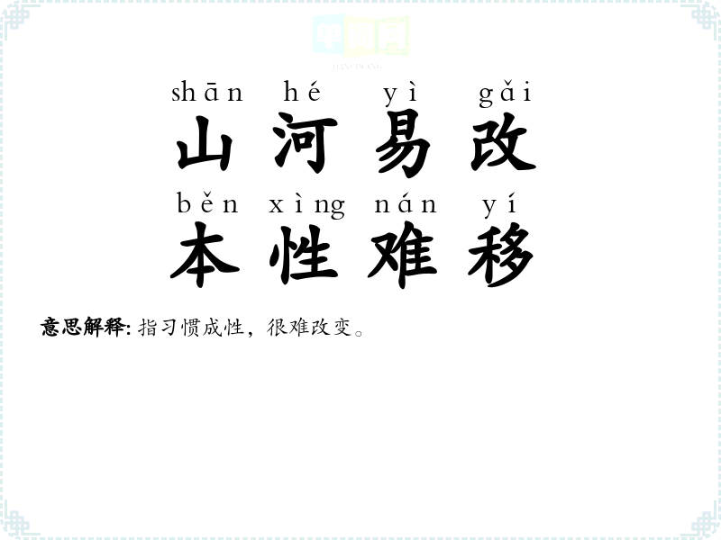 | 山河易改,本性难移 | 指习惯成性,很难改变。 |