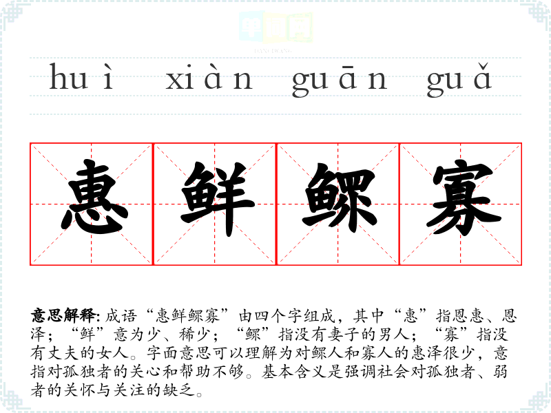 成语“惠鲜鳏寡”由四个字组成,其中“惠”指恩惠、恩泽;“鲜”意为少、稀少;“鳏”指没有妻子的男人;“寡”指没有丈夫的女人。字面意思可以理解为对鳏人和寡人的惠泽很少,意指对孤独者的关心和帮助不够。基本含义是强调社会对孤独者、弱者的关怀与关注的缺乏。