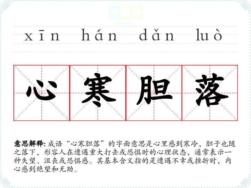 成语“心寒胆落”的字面意思是心里感到寒冷,胆子也随之落下,形容人在遭遇重大打击或恐惧时的心理状态,通常表示一种失望、沮丧或恐惧感。其基本含义指的是遭遇不幸或挫折时,内心感到绝望和无助。