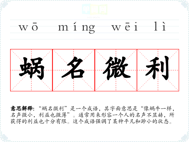 | 蜗名微利 | 蜗名:像蜗牛角那样极微小的名声。虚名小利。亦作“蜗利蝇名”、“蜗名蝇利”。 |