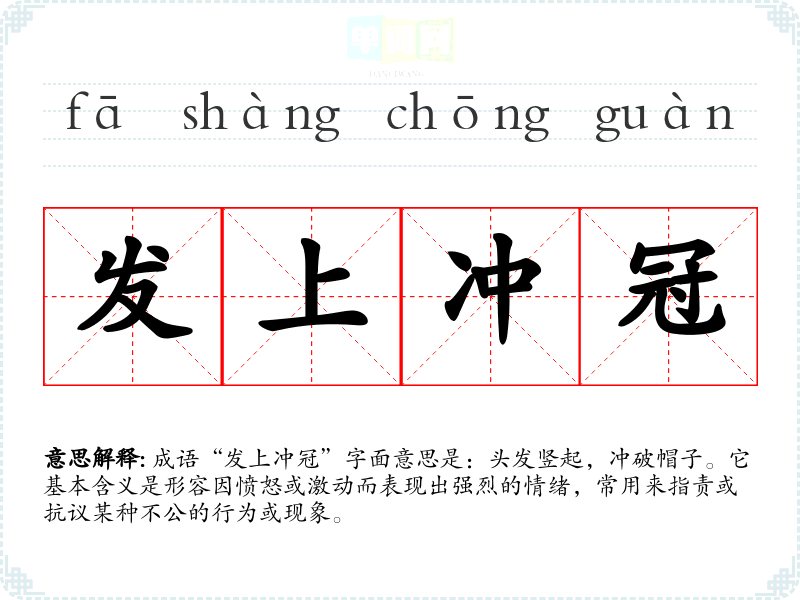 成语“发上冲冠”字面意思是:头发竖起,冲破帽子。它基本含义是形容因愤怒或激动而表现出强烈的情绪,常用来指责或抗议某种不公的行为或现象。