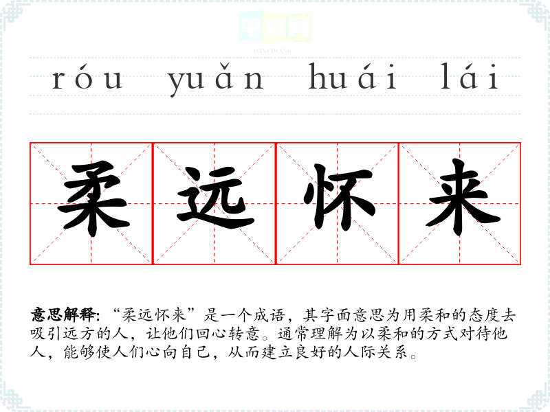 “柔远怀来”是一个成语,其字面意思为用柔和的态度去吸引远方的人,让他们回心转意。通常理解为以柔和的方式对待他人,能够使人们心向自己,从而建立良好的人际关系。