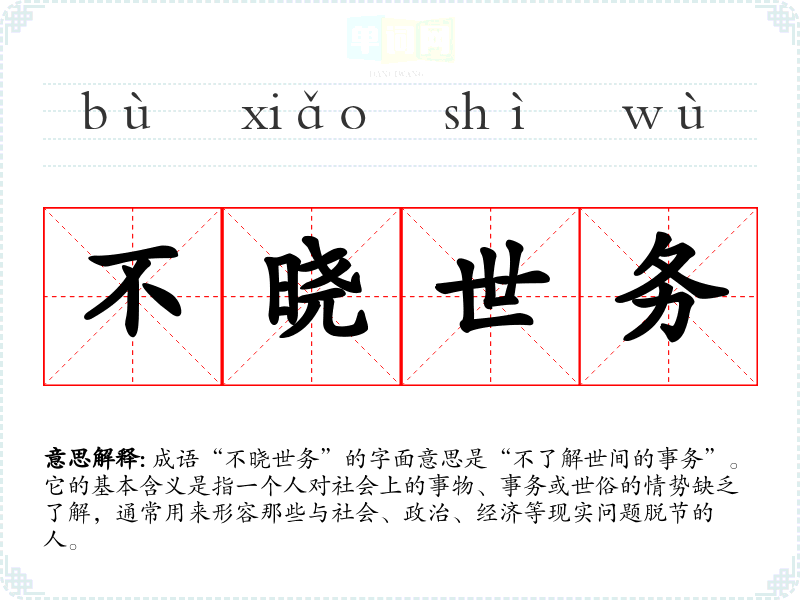 成语“不晓世务”的字面意思是“不了解世间的事务”。它的基本含义是指一个人对社会上的事物、事务或世俗的情势缺乏了解,通常用来形容那些与社会、政治、经济等现实问题脱节的人。