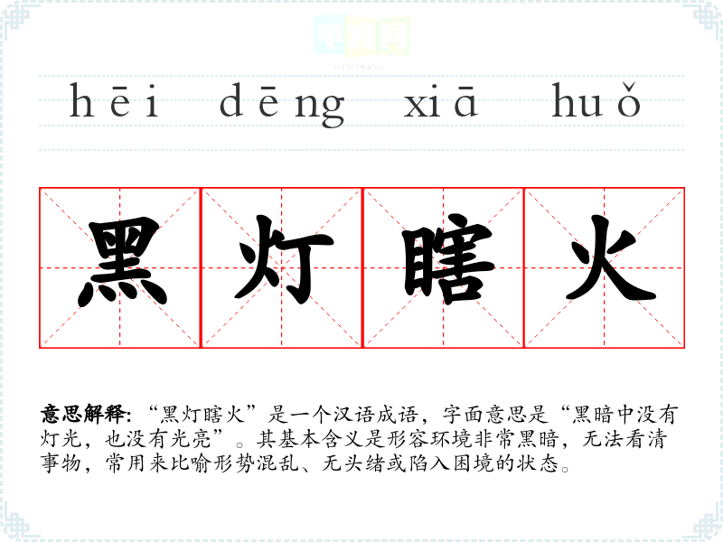 “黑灯瞎火”是一个汉语成语,字面意思是“黑暗中没有灯光,也没有光亮”。其基本含义是形容环境非常黑暗,无法看清事物,常用来比喻形势混乱、无头绪或陷入困境的状态。
