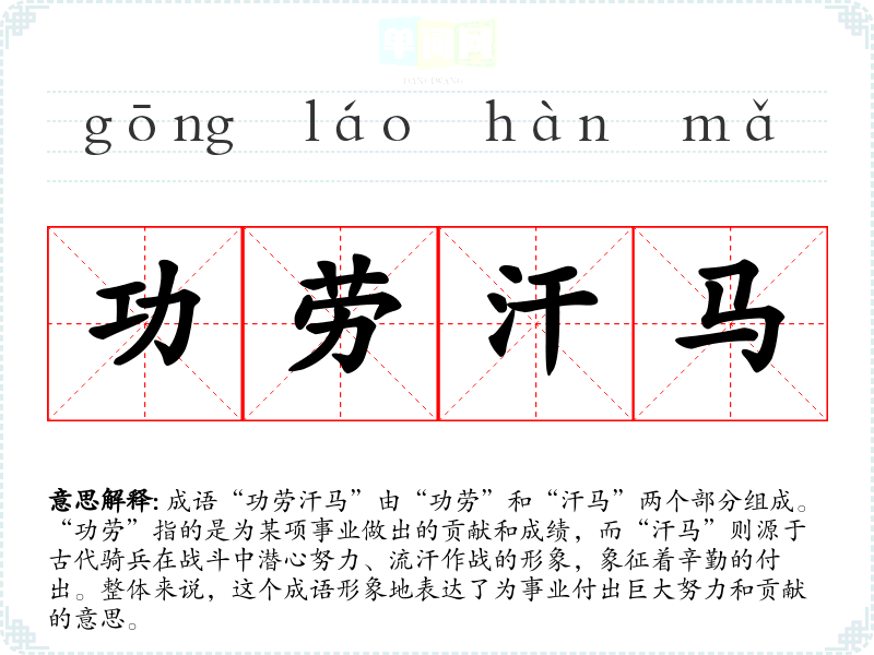 成语“功劳汗马”由“功劳”和“汗马”两个部分组成。“功劳”指的是为某项事业做出的贡献和成绩,而“汗马”则源于古代骑兵在战斗中潜心努力、流汗作战的形象,象征着辛勤的付出。整体来说,这个成语形象地表达了为事业付出巨大努力和贡献的意思。