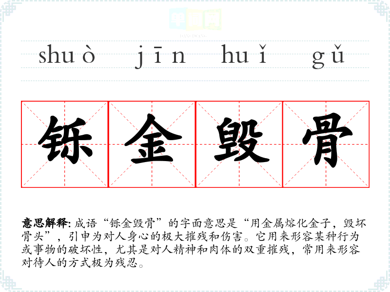 成语“铄金毁骨”的字面意思是“用金属熔化金子,毁坏骨头”,引申为对人身心的极大摧残和伤害。它用来形容某种行为或事物的破坏性,尤其是对人精神和肉体的双重摧残,常用来形容对待人的方式极为残忍。