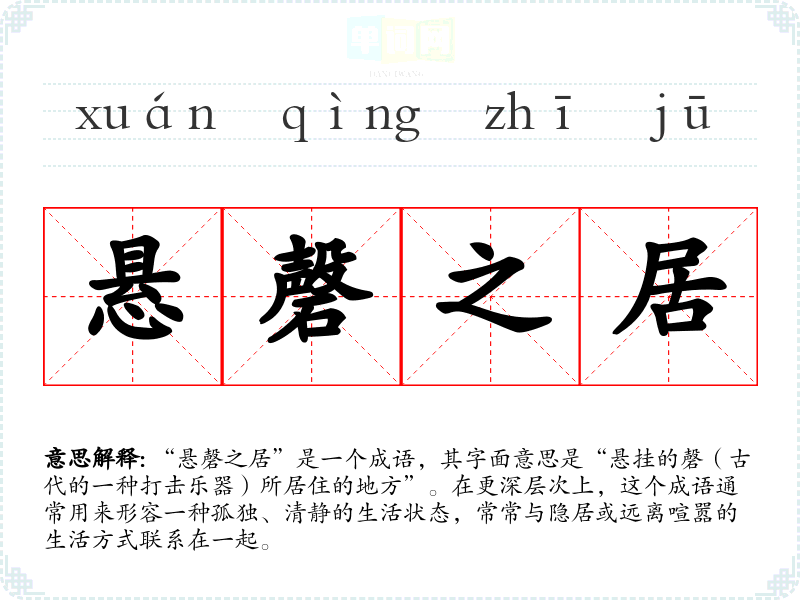 “悬磬之居”是一个成语,其字面意思是“悬挂的磬(古代的一种打击乐器)所居住的地方”。在更深层次上,这个成语通常用来形容一种孤独、清静的生活状态,常常与隐居或远离喧嚣的生活方式联系在一起。