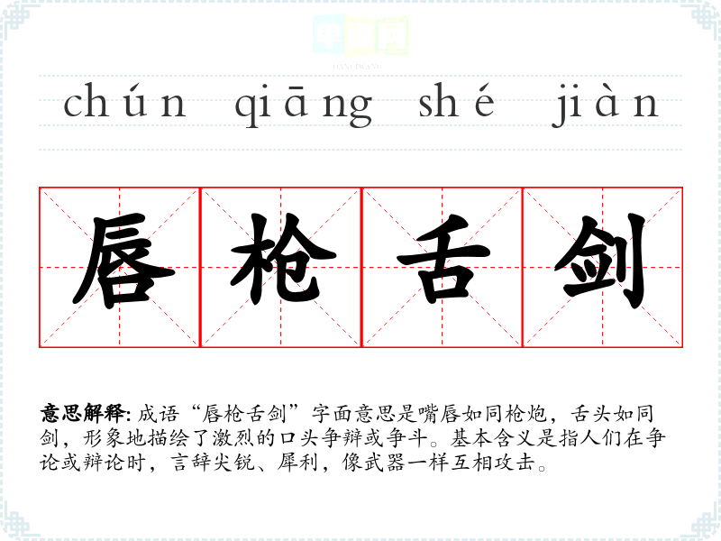 | 唇枪舌剑 | 舌如剑,唇象枪。形容辩论激烈,言词锋利,象枪剑交锋一样。 |