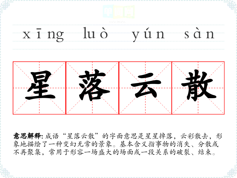 成语“星落云散”的字面意思是星星掉落,云彩散去,形象地描绘了一种变幻无常的景象。基本含义指事物的消失、分散或不再聚集,常用于形容一场盛大的场面或一段关系的破裂、结束。