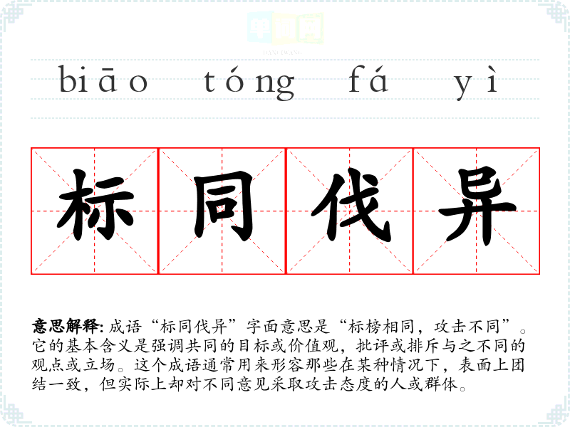 成语“标同伐异”字面意思是“标榜相同,攻击不同”。它的基本含义是强调共同的目标或价值观,批评或排斥与之不同的观点或立场。这个成语通常用来形容那些在某种情况下,表面上团结一致,但实际上却对不同意见采取攻击态度的人或群体。