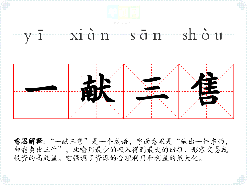 “一献三售”是一个成语,字面意思是“献出一件东西,却能卖出三件”,比喻用最少的投入得到最大的回报,形容交易或投资的高效益。它强调了资源的合理利用和利益的最大化。