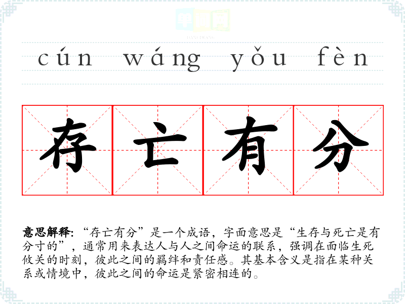 “存亡有分”是一个成语,字面意思是“生存与死亡是有分寸的”,通常用来表达人与人之间命运的联系,强调在面临生死攸关的时刻,彼此之间的羁绊和责任感。其基本含义是指在某种关系或情境中,彼此之间的命运是紧密相连的。